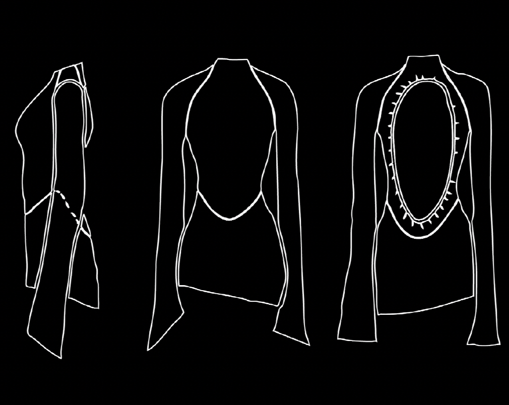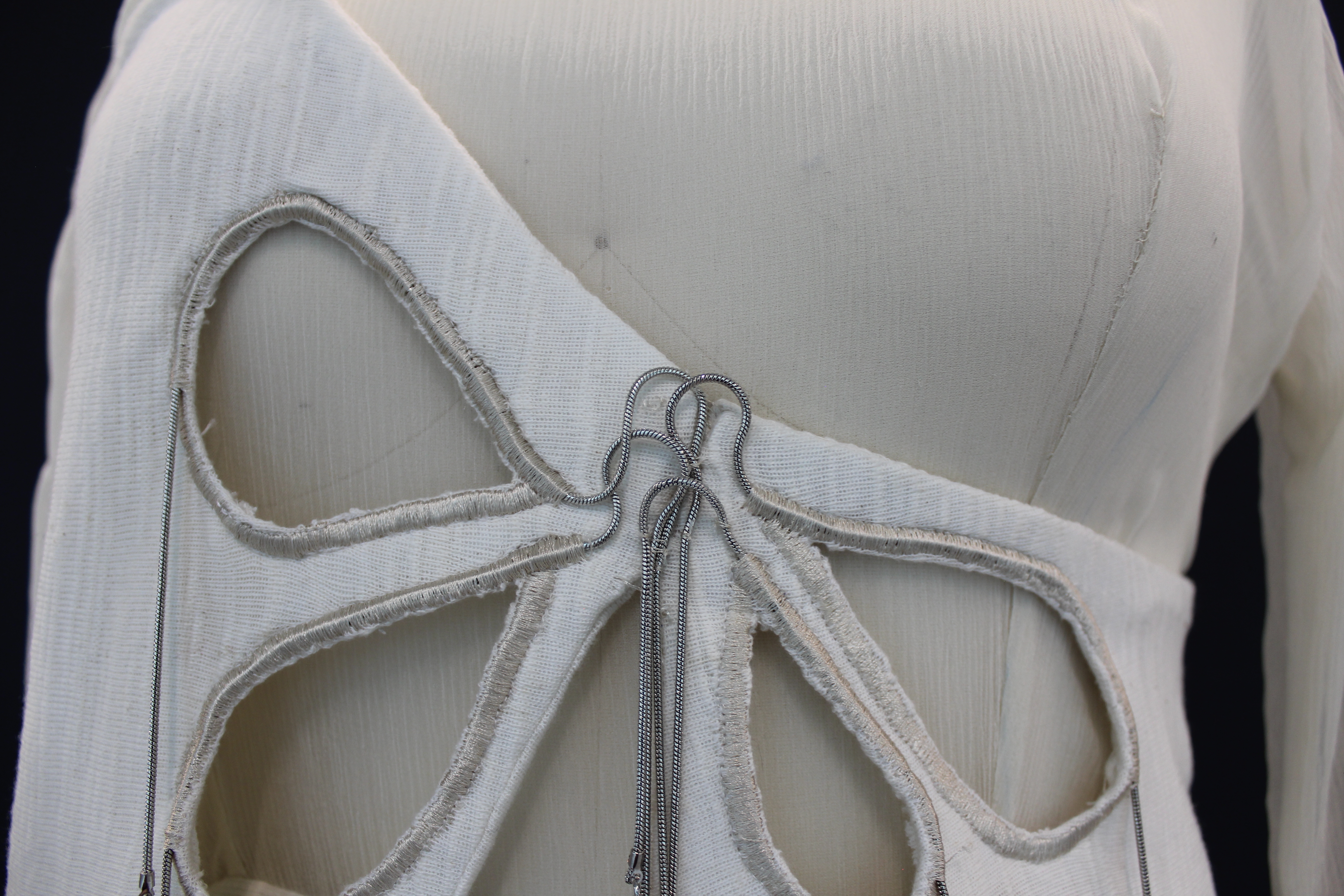This look was drafted using CLO3D pattern software. Each piece was trued and fit by hand while the corset-like garment was draped on a mannequin, informing the base pattern.