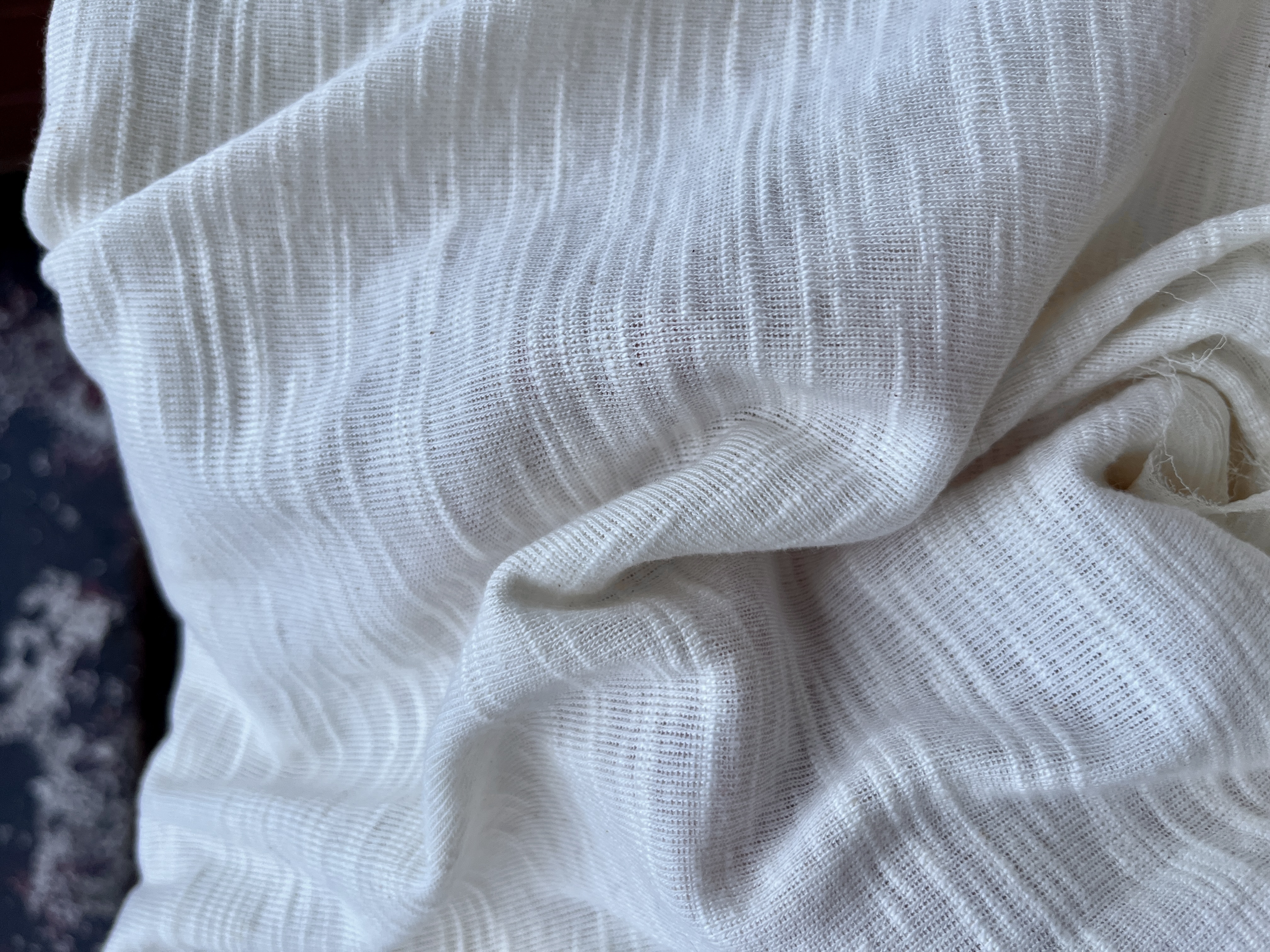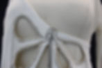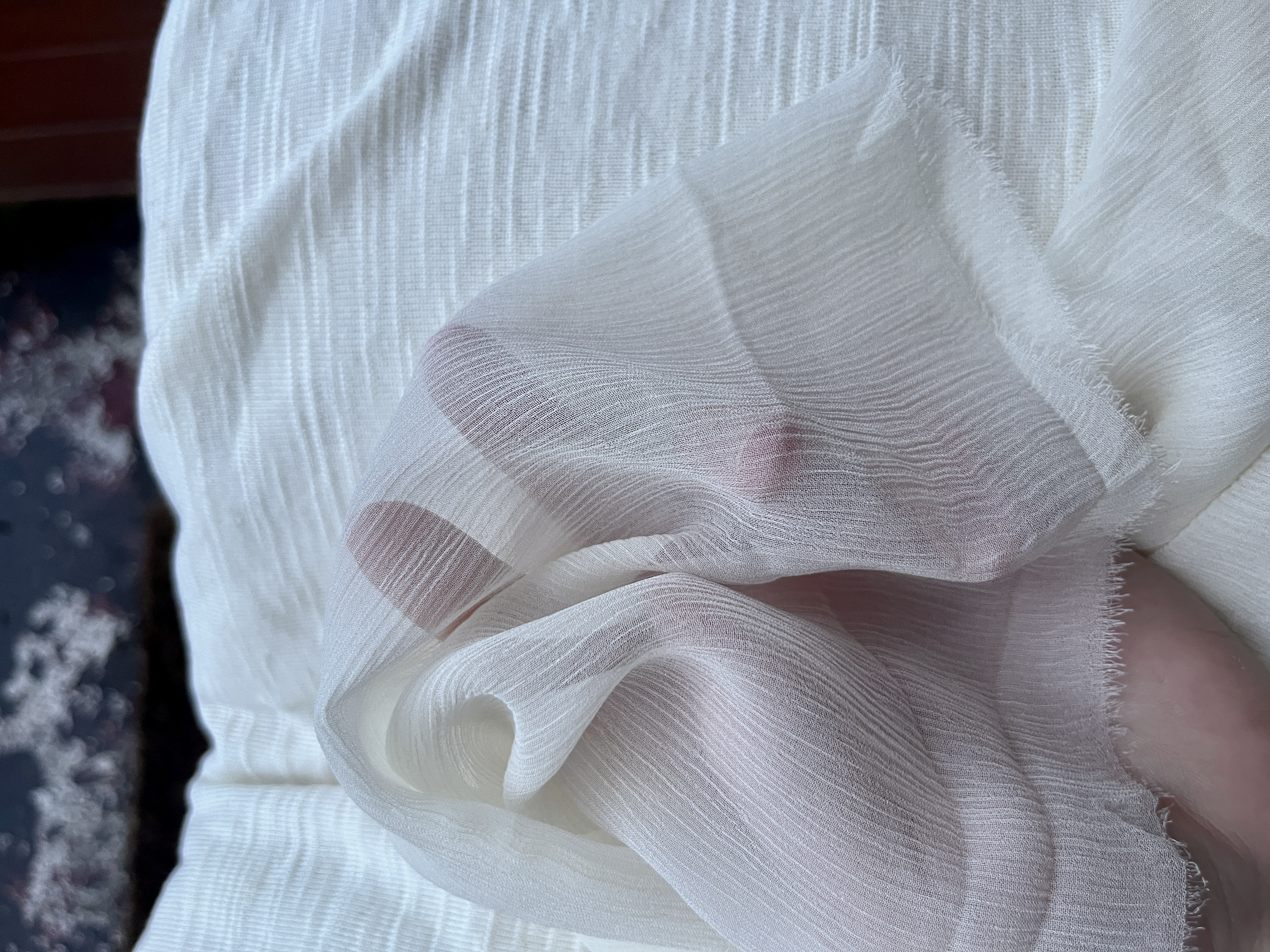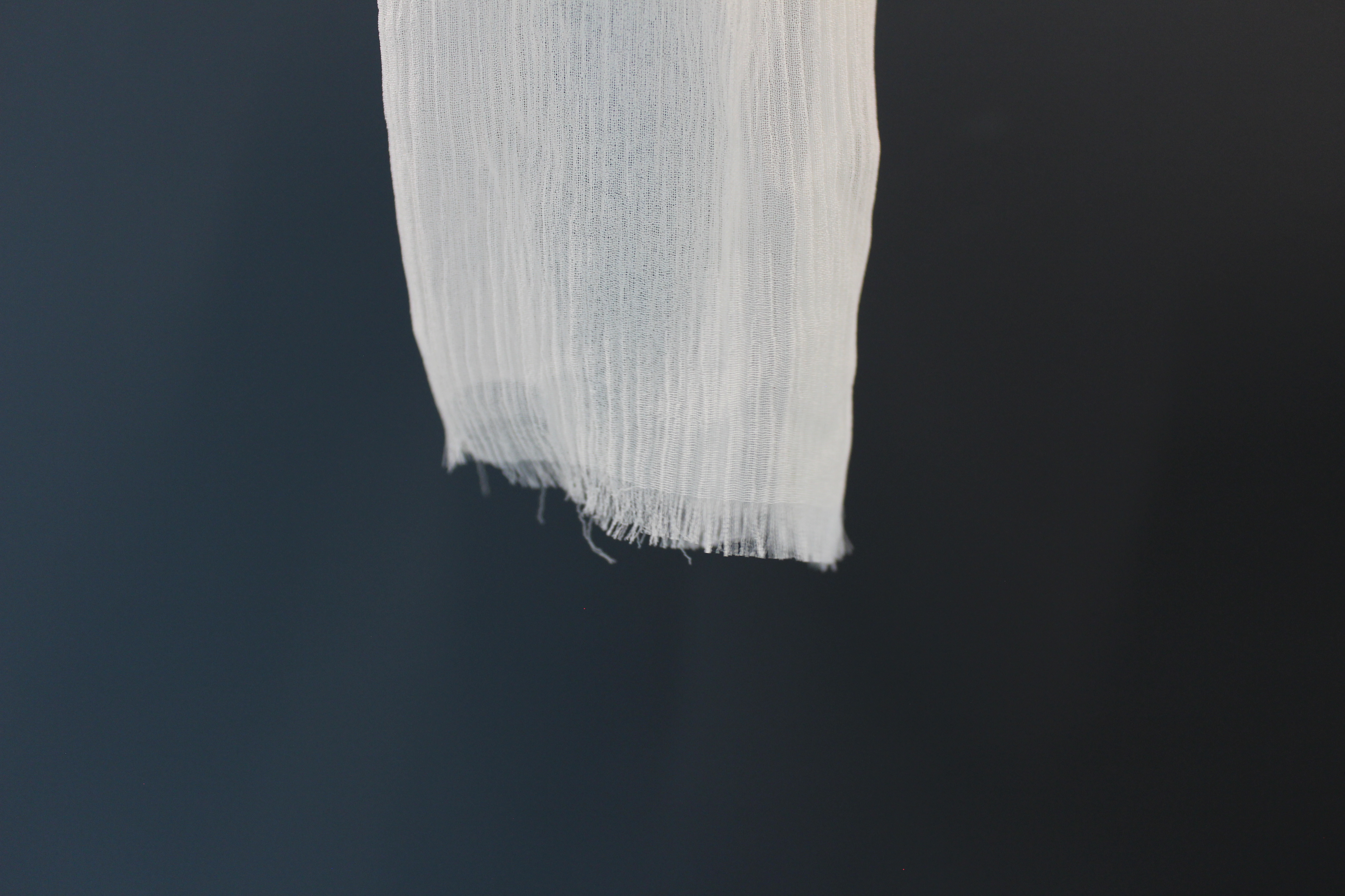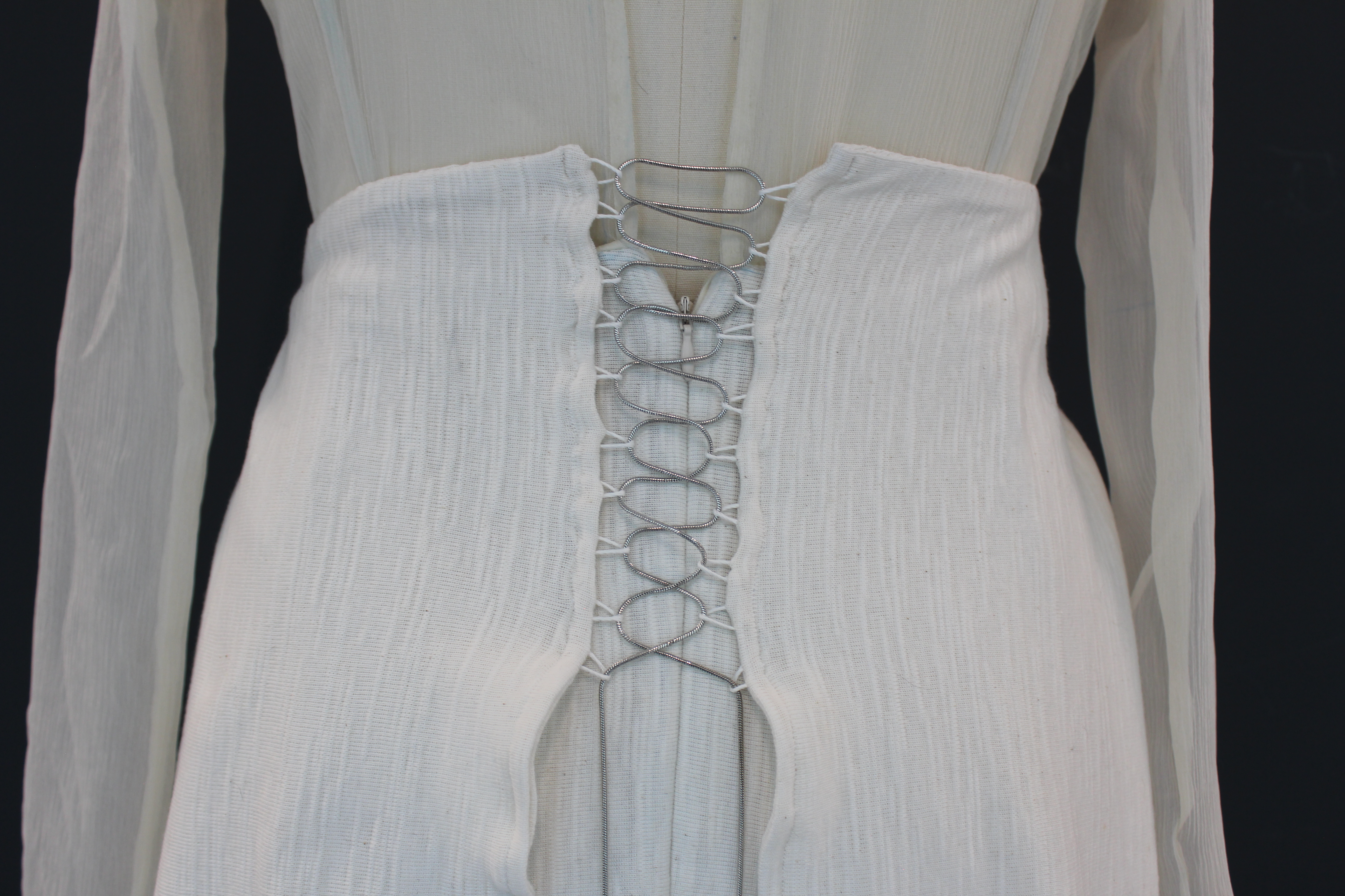 The silk chiffon top frays and flows along the body with handsewn darting and raglan french seams appearing as more rigid structural lines, like the segmented wing. The skirt and outer corset-like piece, tightened and secured with a metallic lacing back, acts as the abdomen or thorax, providing an asymmetrical shaping to the multi-piece look. The solid pieces are a textured cotton knit.