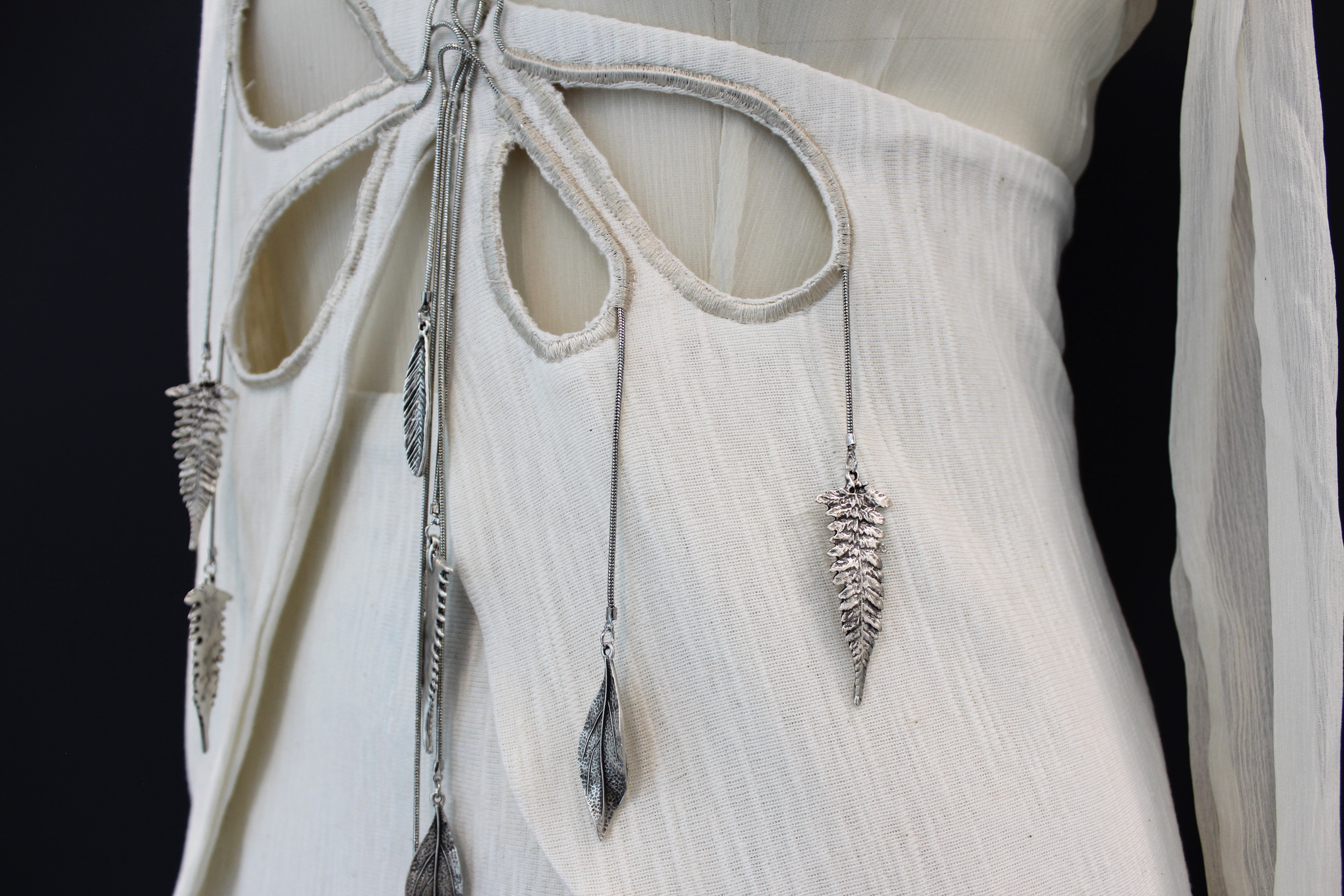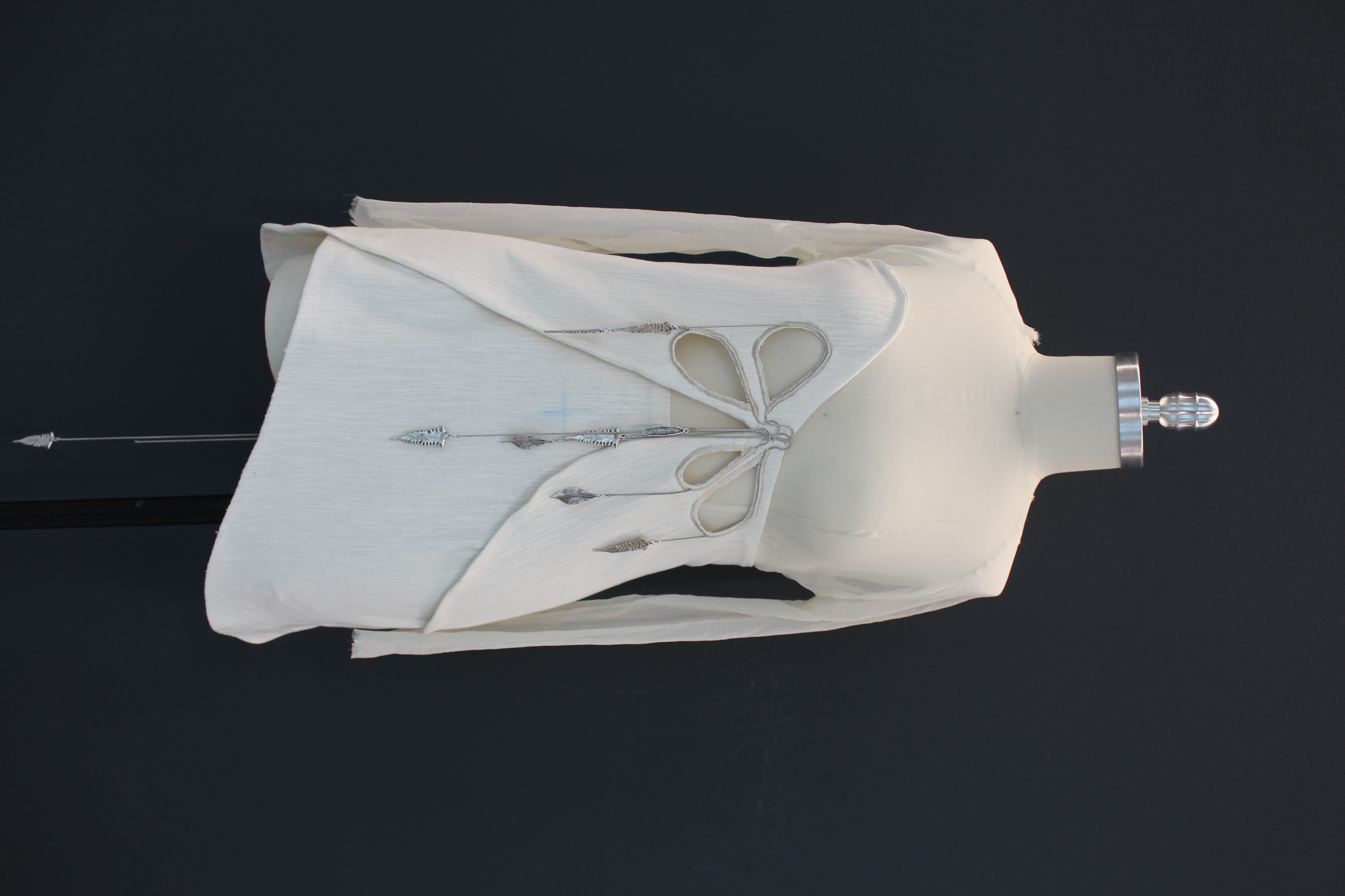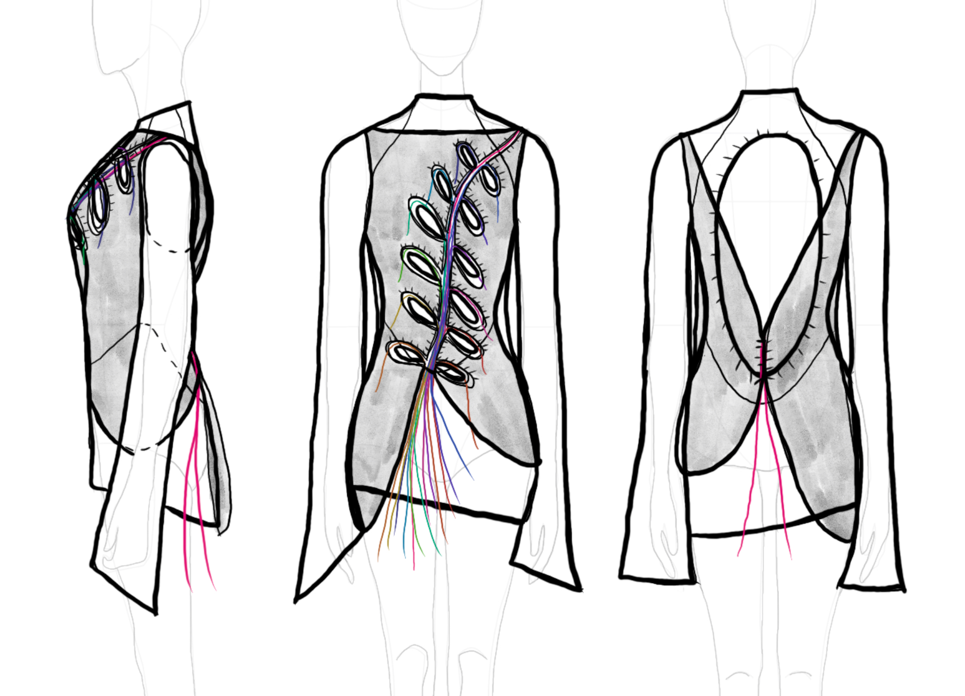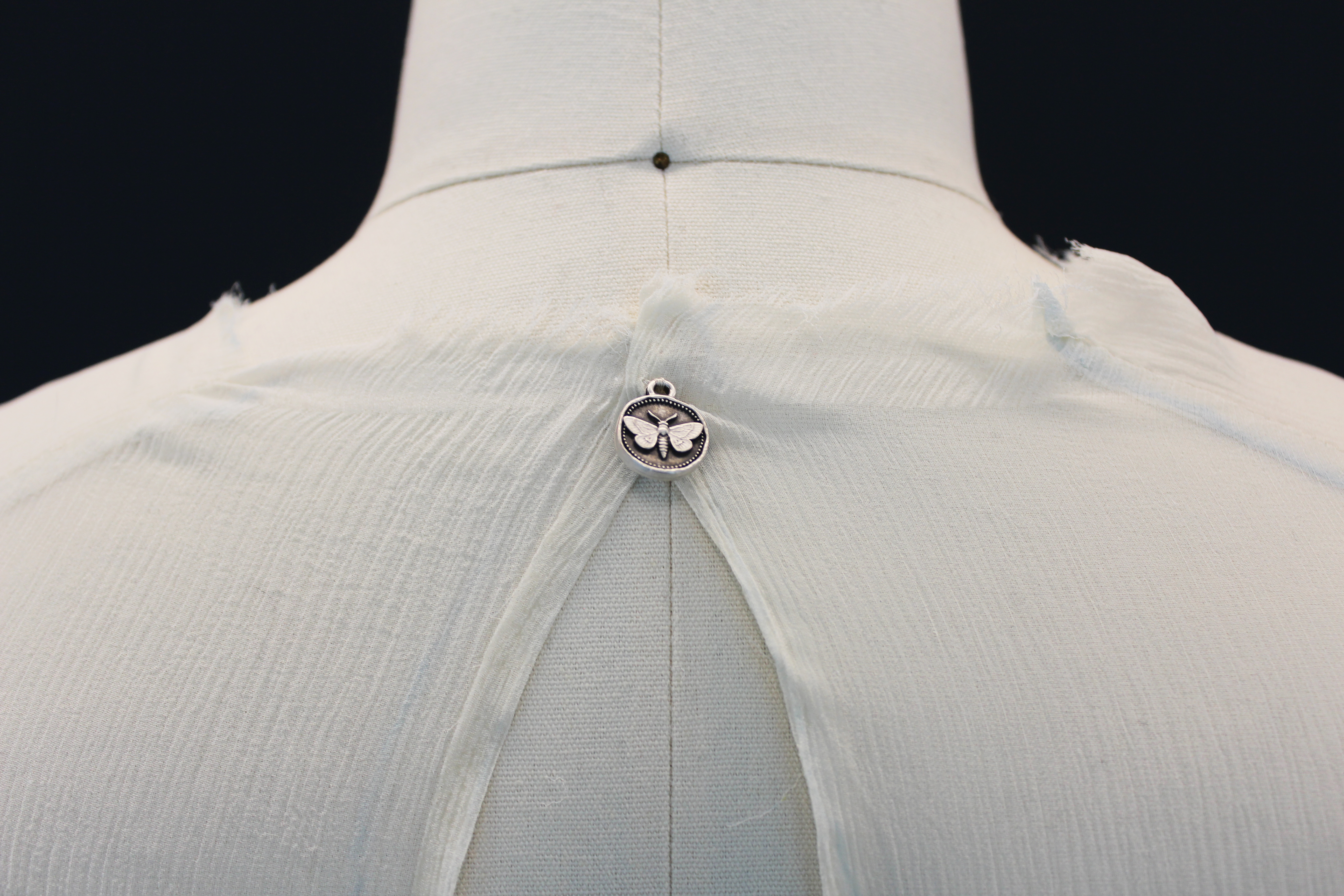Inspired by the anatomy and appearance of the Tussock moth, this look explores layered material transparencies and textures, machine embroidered applique techniques, and metallic closure systems.
